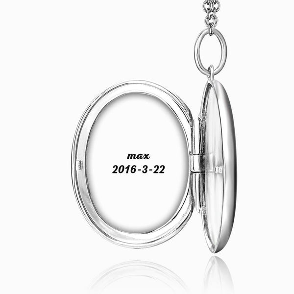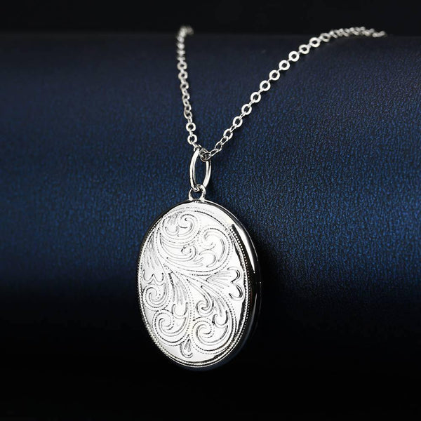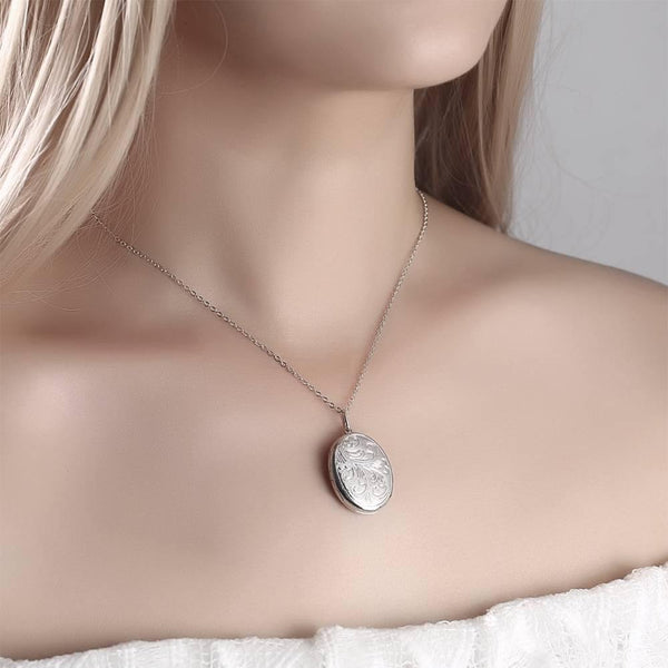 Embossed Oval Photo Locket Necklace With Engraving Platinum Plated