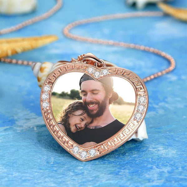 Men's Personalized Rhinestone Crystal Heart Shape Photo Engraved Necklace Rose Gold Plated - Colorful