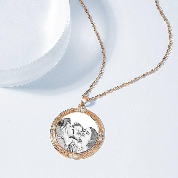 Men's Personalized Rhinestone Crystal Round Shape Photo Engraved Necklace Rose Gold Plated - Sketch