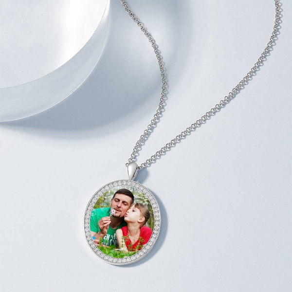 Women's Engraved Personalized Rhinestone Crystal Shield Shape Photo Necklace Platinum Plated Silver - Colorful