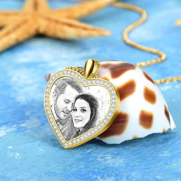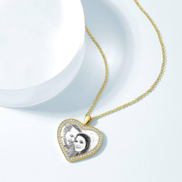 Women's Personalized Rhinestone Crystal Heart Shape Photo Engraved Necklace 14K Gold Plated Golden - Sketch