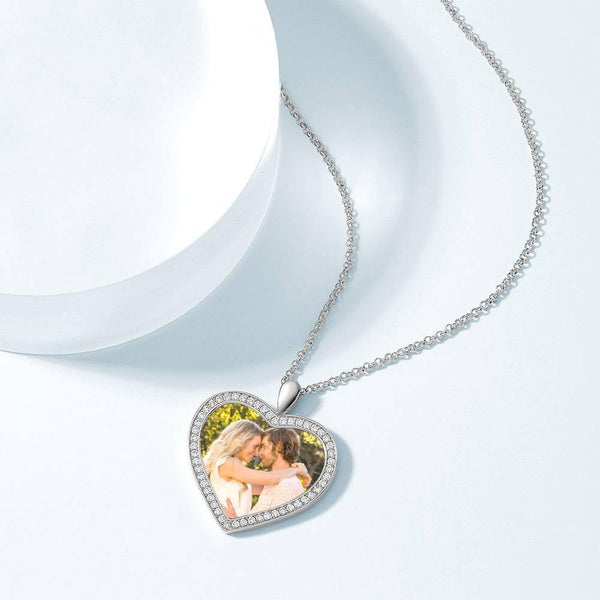 Women's Personalized Rhinestone Crystal Heart Shape Photo Engraved Necklace Platinum Plated Silver - Colorful