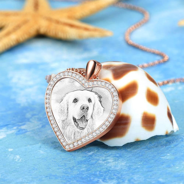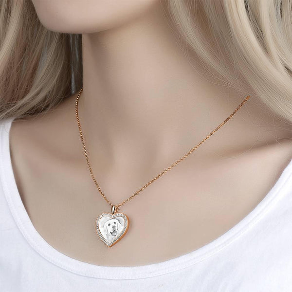Women's Personalized Rhinestone Crystal Heart Shape Photo Engraved Necklace Rose Gold Plated - Sketch