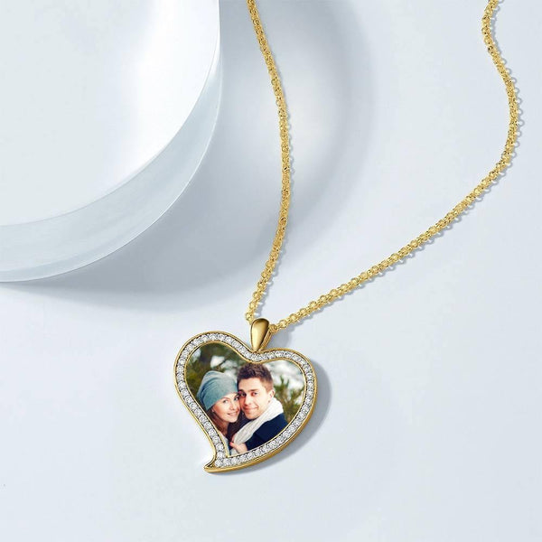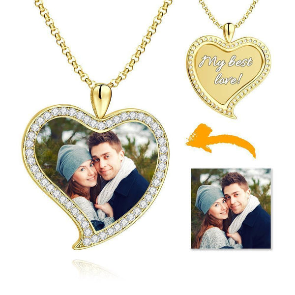 Women's Personalized Rhinestone Crystal Love Heart Shape Photo Engraved Necklace 14K Gold Plated Golden - Colorful