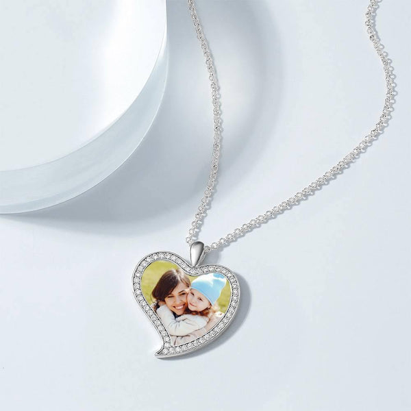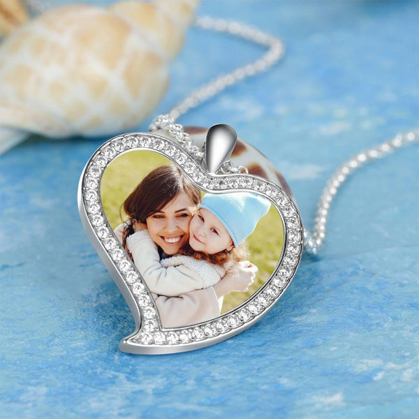 Women's Personalized Rhinestone Crystal Love Heart Shape Photo Engraved Necklace Platinum Plated Silver - Colorful