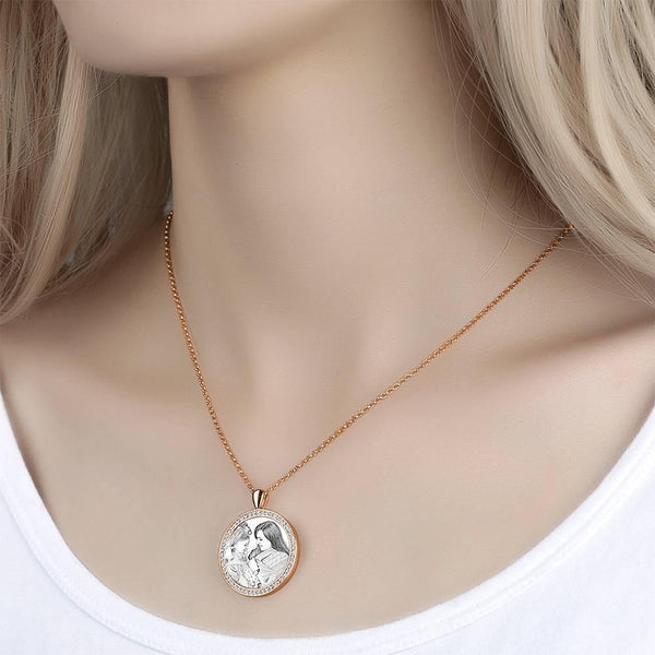 Women's Personalized Rhinestone Crystal Round Shape Photo Engraved Necklace Rose Gold Plated - Sketch