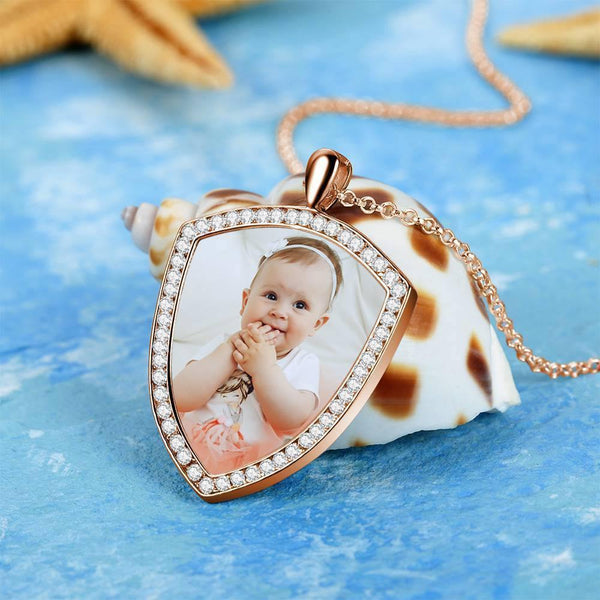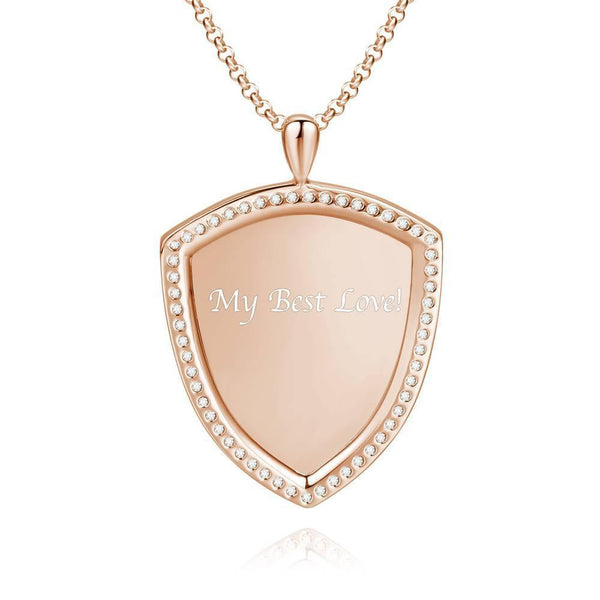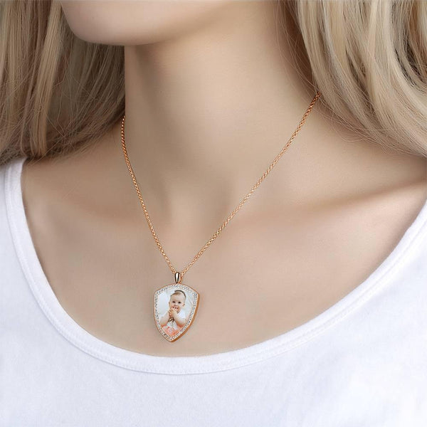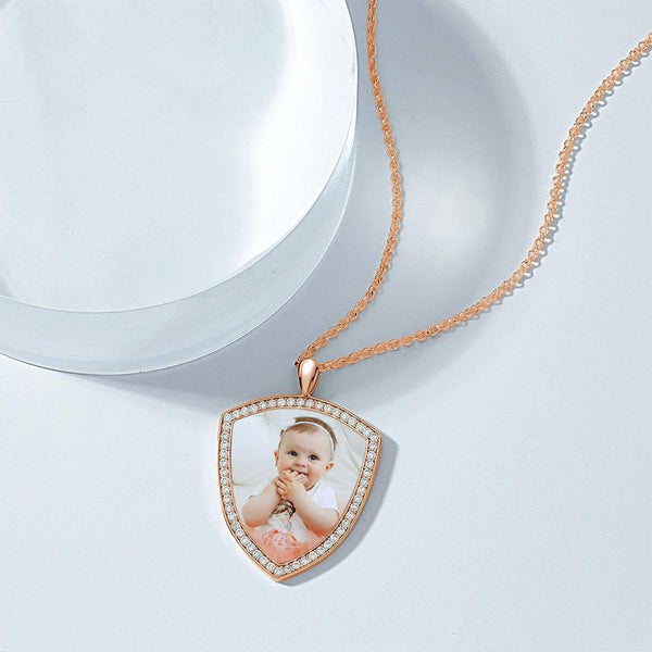 Women's Personalized Rhinestone Crystal Shield Shape Photo Engraved Necklace Rose Gold Plated - Colorful