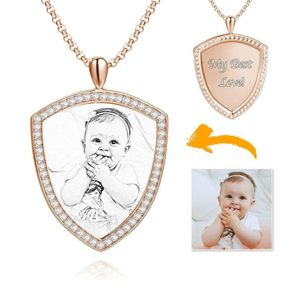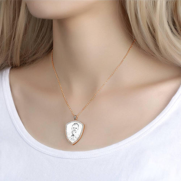 Women's Personalized Rhinestone Crystal Shield Shape Photo Engraved Necklace Rose Gold Plated - Sketch